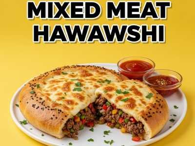 حواوشي بمزيج اللحوم (لحمة + سجق + بسطرمة) مغطى بخلطة البيتزا.