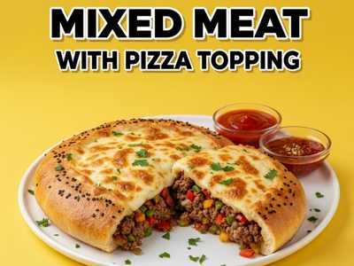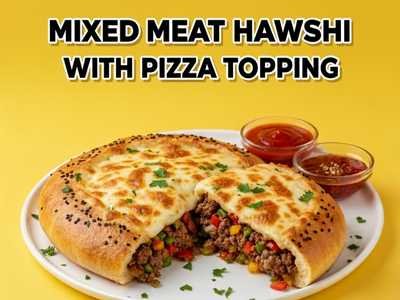 حواوشي بمزيج اللحوم (لحمة + سجق + بسطرمة) مغطى بخلطة البيتزا.