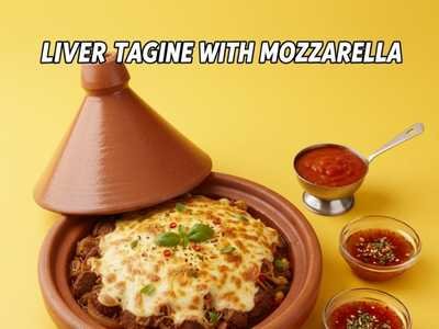 طاجن كبدة مخبوز مغطى بجبنة الموزاريلا المذابة.
